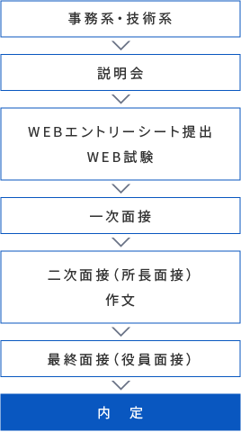 説明会で応募や業務内容の詳しい説明をいたしますので、まずは説明会への参加をお願いします。説明会の後、WEBによるエントリーシートの提出およびWEB試験(言語、計数、適性)を受けていただき、面接選考となります。(選考ステップは、変更する場合もありますので、ご承知おきください。)なお、説明会のみの参加でも結構ですので、まずはお気軽にご参加ください。